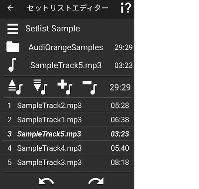 セットリストエディタでは、希望する順番にトラックをリストに並べます。 デバイスにある任意のトラックを選択できます。